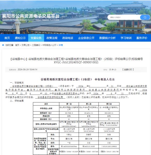 项目名称:谷城县地质灾害综合治理工程1(2标段)招标编码:XYGC-JSGC202405QT-009001002招标人:谷城县自然资源和规划局相关网络截图:相关网络链接:谷城县地质灾害综合治理工程1(2标段)评标结果公示