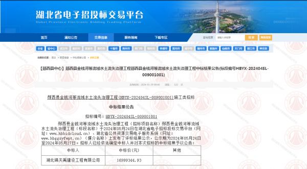 项目名称:郧西县金钱河等流域水土流失治理工程招标编码:HBYX-202404SL-009001001招标人:郧西县天源水务投资开发有限公司相关网络截图:相关网络链接:郧西县金钱河等流域水土流失治理工程中标结果公告