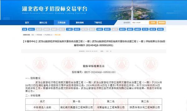 项目名称:武当山旅游经济特区地质灾害综合治理工程(一期)招标编码:HBSY-202404QG-005001001招标人:武当山旅游经济特区自然资源和规划局相关网络截图:相关网络链接:武当山旅游经济特区地质灾害综合治理工程(一期)评标结果公示