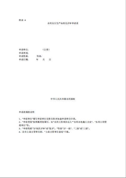 水利安全生产标准化申请材料报送要求 为进一步规范水利安全生产标准化申请材料报送工作,根据《水利部关于印发<水利安全生产标准化评审管理暂行办法>的通知》(水安监〔2013〕189号,以下简称《暂行办法》)、《水利部办公厅