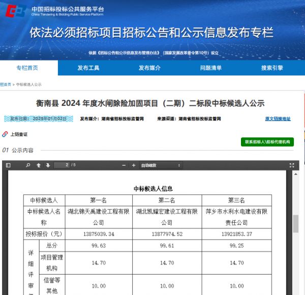 项目名称:衡南县 2024 年度水闸除险加固项目(二期)二标段招标编码:H430400020785001招 标 人:衡南县水旱灾害防御事务中心相关网络截图:相关网络链接:衡南县 2024 年度水闸除险加固项目(二期)二标段中标候选人公示