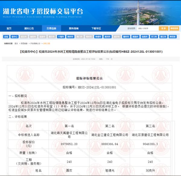 项目名称:松滋市2024年水利工程险情隐患整治工程招标编码:HBSZ-202412SL-013001001招 标 人:松滋金投城乡资源开发管理有限公司相关网络截图:相关网络链接:松滋市2024年水利工程险情隐患整治工程评标结果公示