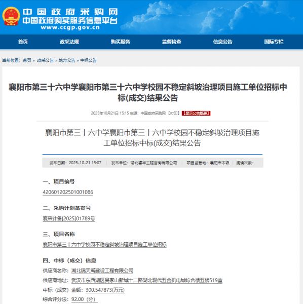 项目名称:襄阳市第三十六中学校园不稳定斜坡治理项目招标编码:420601202501001086招 标 人:襄阳市第三十六中学相关网络截图:相关网络链接:襄阳市第三十六中学校园不稳定斜坡治理项目施工单位招标中标(成交)结果公告