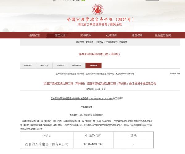 项目名称:沮漳河流域系统治理工程(荆州段)招标编码:JZSJ-202509SL-008001001招 标 人:湖北荆州菱角湖国家湿地公园管理处相关网络截图:相关网络链接:沮漳河流域系统治理工程(荆州段)施工标段中标结果公告