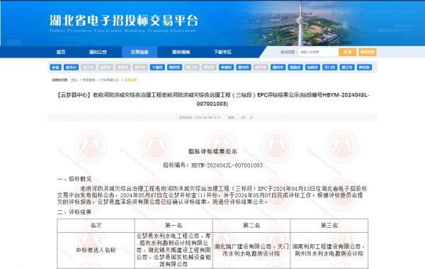 项目名称:老府河防洪减灾综合治理工程(三标段)EPC招标编码:HBYM-202404SL-007001003招标人:云梦县鑫泽投资有限公司相关网络截图:相关网络链接:老府河防洪减灾综合治理工程(三标段)EPC评标结果公示