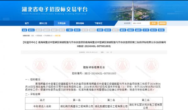 项目名称:南海闸重点中型灌区续建配套与节水改造项目第三标段招标编码:HBSZ-202404SL-007001003招标人:松滋市南海镇水利管理站相关网络截图:相关网络链接:南海闸重点中型灌区续建配套与节水改造项目第三标段评标结果公示