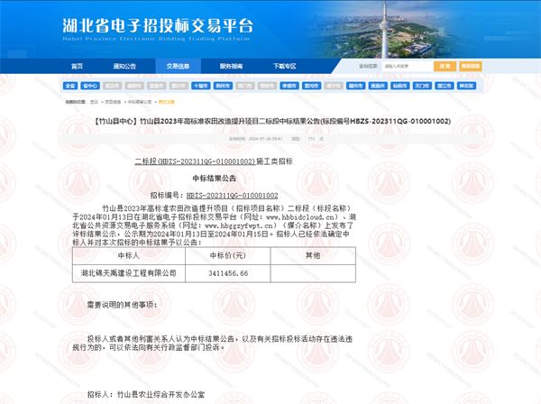 项目名称:竹山县2023年高标准农田改造提升项目二标段招标编码:HBZS-202311QG-010001002招标人:竹山县农业综合开发办公室相关网络截图: 相关网络链接:竹山县2023年高标准农田改造提升项目二标段中标结果公示