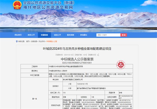 项目名称:叶城县2024年乌吉热克乡种植业基地配套建设项目 招标人:叶城县乌吉热克乡人民政府 相关网络截图:相关网络链接:叶城县2024年乌吉热克乡种植业基地配套建设项目中标候选人公示备案表