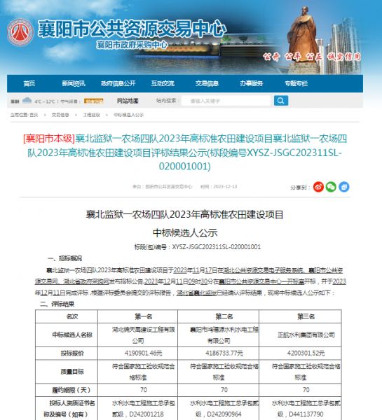 项目名称:襄北监狱一农场四队2023年高标准农田建设项目招标编码:XYSZ-JSGC202311SL-020001001招标人:湖北省襄北监狱相关网络截图:相关网络链接:襄北监狱一农场四队2023年高标准农田建设项目评标结果公示