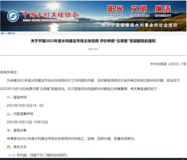 相关网络截图:相关网络链接:关于开展2023年度水利建设市场主体信用 评价申报“云课堂”答疑服务的通知