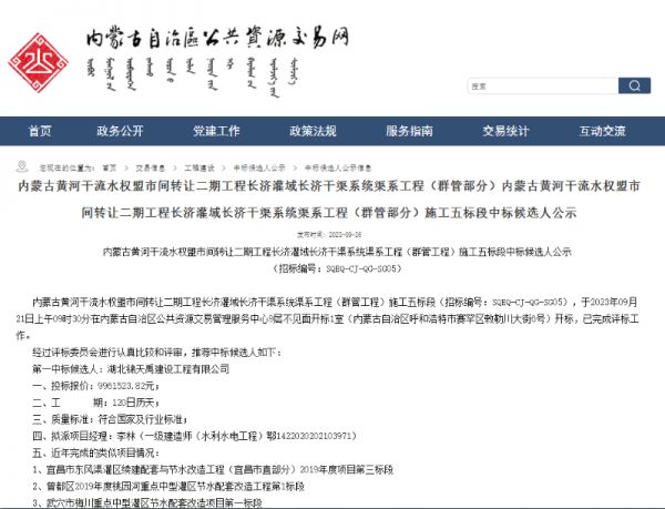 项目名称:内蒙古黄河干流水权盟市间转让二期工程长济灌域长济干渠系统渠系工程(群管工程)施工五标段中标人:九游官方网页版_九游(中国),招标编码:SQEQ-CJ-QG-SG05招标人:内蒙古自治区水权收储转让中心有限公司巴彦淖尔市水利局相关网络截