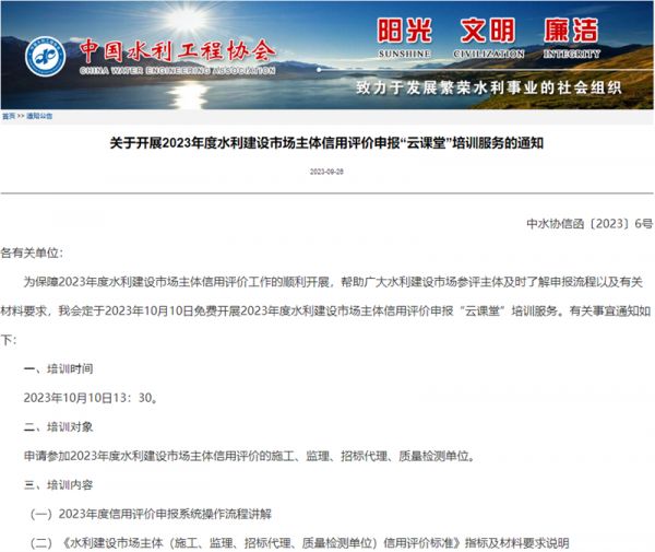 相关网络截图:相关网络链接:关于开展2023年度水利建设市场主体信用评价申报“云课堂”培训服务的通知