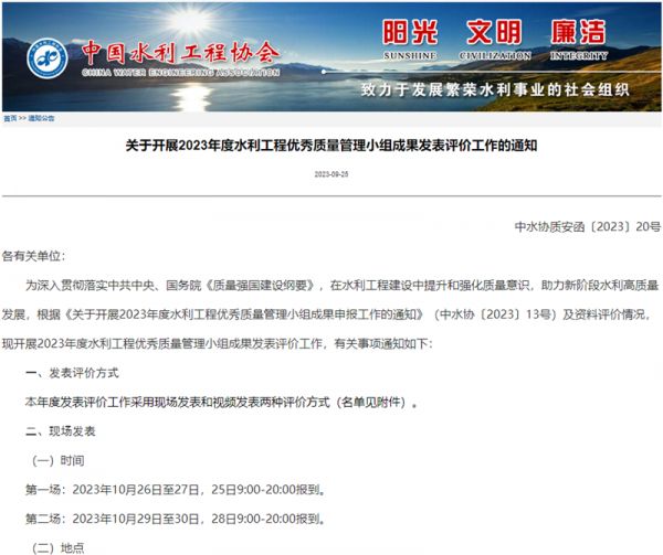 相关网络截图:相关网络链接:关于开展2023年度水利工程优秀质量管理小组成果发表评价工作的通知