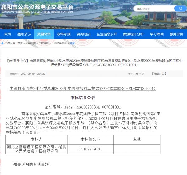 项目名称:南漳县观沟等8座小型水库2023年度除险加固工程南漳县观沟等8座小型水库2023年度除险加固工程中标人:九游官方网页版_九游(中国),招标编码:XYNZ-JSGC202308SL-007001001招标人:南漳县小型水库除险加固项目建