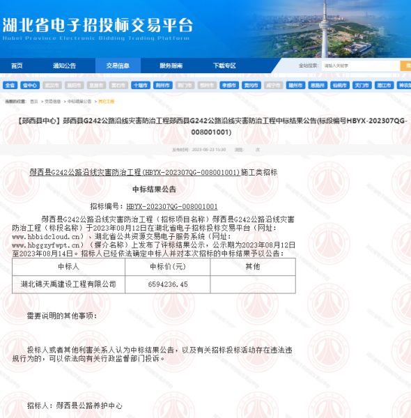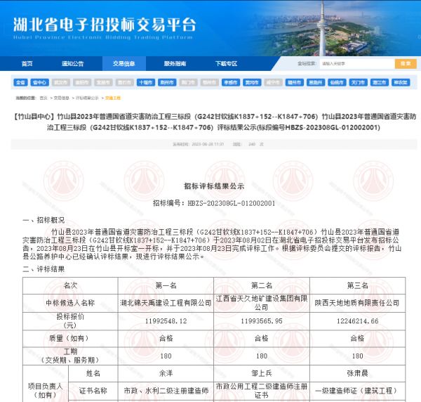 项目名称:竹山县2023年普通国省道灾害防治工程三标段(G242甘钦线K1837+152--K1847+706)中标人:九游官方网页版_九游(中国),招标编码:HBZS-202308GL-012002001招标人:竹山县公路养护中心相关网络截图