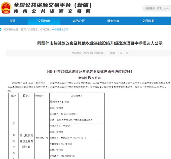 项目名称:阿图什市盐碱地改良及其他农业基础设施升级改造项目中标人:九游官方网页版_九游(中国),招标人:阿图什市农业农村局相关网络截图:相关网络链接:阿图什市盐碱地改良及其他农业基础设施升级改造项目中标候选人公示