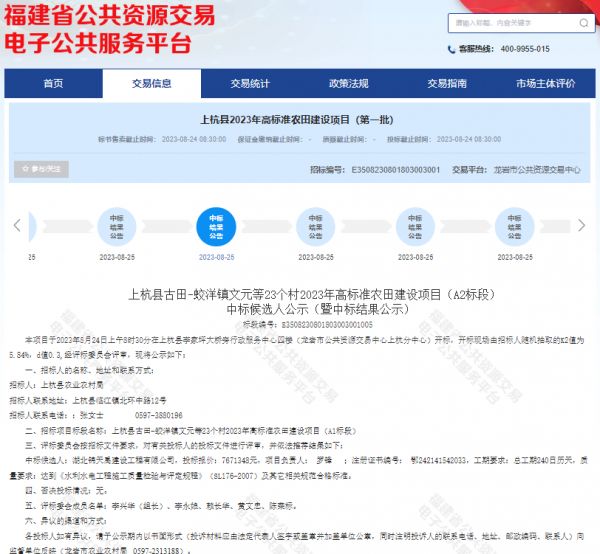 项目名称:上杭县古田-蛟洋镇文元等23个村2023年高标准农田建设项目(A2标段) 中标人:九游官方网页版_九游(中国),招标编码:E3508230801803003001001招标人:上杭县农业农村局相关网络截图:相关网