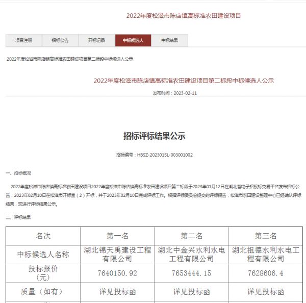 项目名称:2022年度松滋市陈店镇高标准农田建设项目第二标段招标编码:HBSZ-202301SL-003001002招标人:松滋市农田建设整理中心相关网络截图:相关网络链接:2022年度松滋市陈店镇高标准农田建设项目第二标段中标候选人公示