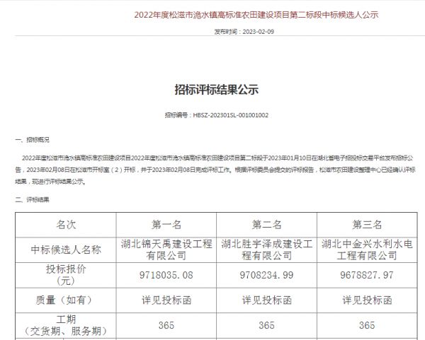 项目名称:2022年度松滋市洈水镇高标准农田建设项目第二标段招标编码:HBSZ-202301SL-001001002招标人:松滋市农田建设整理中心相关网络截图:相关网络链接:2022年度松滋市洈水镇高标准农田建设项目第二标段中标候选人公示