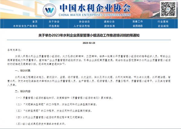 相关网络截图:相关网络链接: 关于举办2023年水利企业质量管理小组活动工作推进培训班的预通知