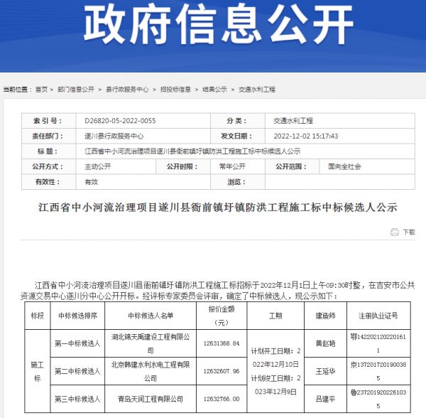 项目名称:江西省中小河流治理项目遂川县衙前镇圩镇防洪工程施工招标编码:/招标人:遂川县水利投资公司相关网络截图:相关网络链接:http://www.suichuan.gov.cn/xxgk-show-10273322.html