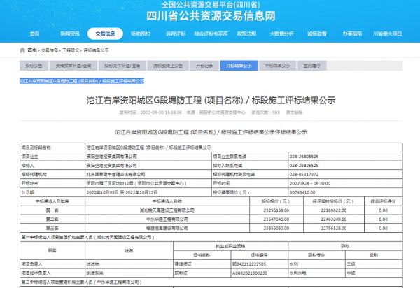 项目名称:沱江右岸资阳城区G段堤防工程施工招标编码:招标人:资阳空港投资集团有限公司相关网络截图:相关网络链接:http://ggzyjy.sc.gov.cn/jyxx/002001/002001006/20220930/2471a318-