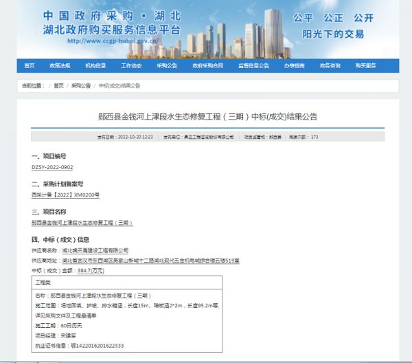 项目名称:郧西县金钱河上津段水生态修复工程(三期)招标编码:DZSY-2022-0902招标人:郧西县水利和湖泊局相关网络截图:相关网络链接:http://www.ccgp-hubei.gov.cn/notice/202210/notice