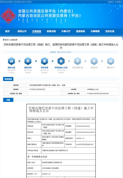 项目名称:巴林右旗巴彦查干河治理工程(续建)施工招标编码:F1504012025052201招 标 人:巴林右旗中小河流治理工程建设管理处相关网络截图:相关网络链接:巴林右旗巴彦查干河治理工程(续建)施工、监理巴林右旗巴彦查干河治理工程(续