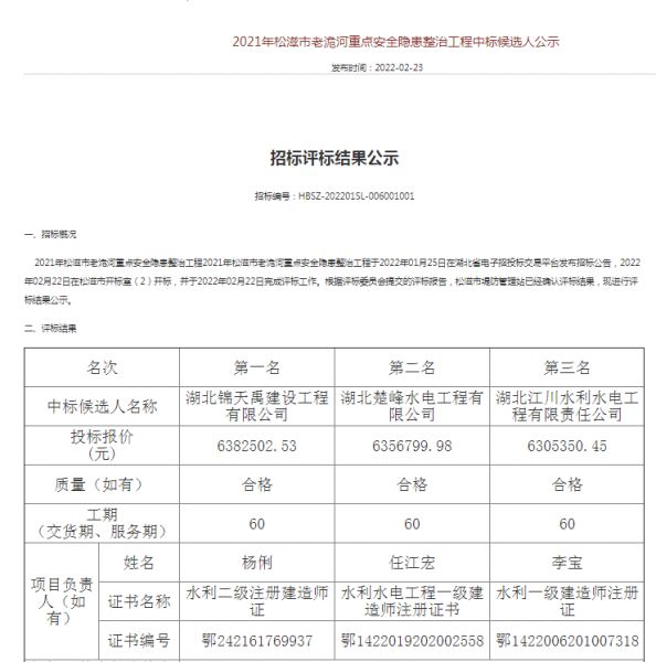 项目名称:2021年松滋市老洈河重点安全隐患整治工程招标编码:HBSZ-202201SL-006001001招标人:松滋市堤防管理站相关网络截图:相关网络链接:2021年松滋市老洈河重点安全隐患整治工程中标候选人公示