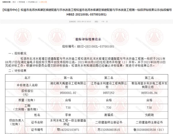 项目名称:松滋市北河水库灌区续建配套与节水改造工程第一标段招标编码:HBSZ-202108SL-037001001招标人:松滋市水利和湖泊局相关网络截图:相关网络链接:松滋市北河水库灌区续建配套与节水改造工程第一标段评标结果公示