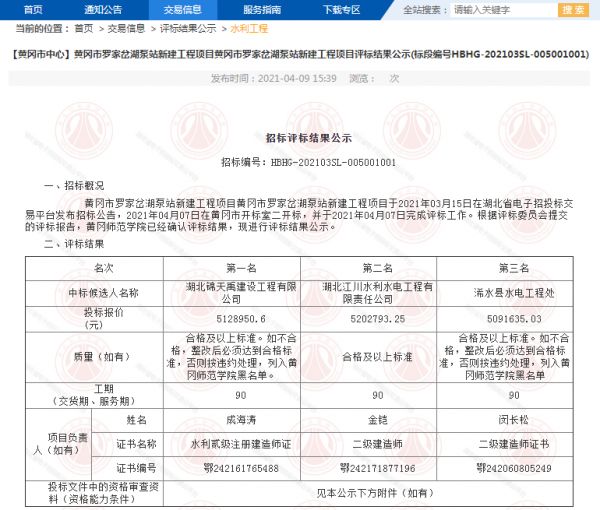 项目名称:黄冈市罗家岔湖泵站新建工程项目招标编码:HBHG-202103SL-005001001招标人:黄冈师范学院相关网络截图:相关网络链接:黄冈市罗家岔湖泵站新建工程项目评标结果公示