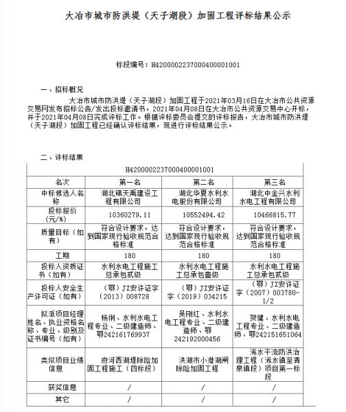 项目名称:大冶市城市防洪堤(天子湖段)加固工程项目编码:H4200002237000400001001招标人:大冶市水利和湖泊局相关网络截图:相关网络链接:大冶市城市防洪堤(天子湖段)加固工程评标结果公示