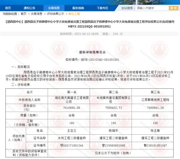 项目名称:郧西县店子镇牌楼中心小学大块地滑坡治理工程招标编码:HBYX-202103QG-001001001招标人:郧西县自然资源和规划局相关网络截图:相关网络链接:郧西县店子镇牌楼中心小学大块地滑坡治理工程评标结果公示