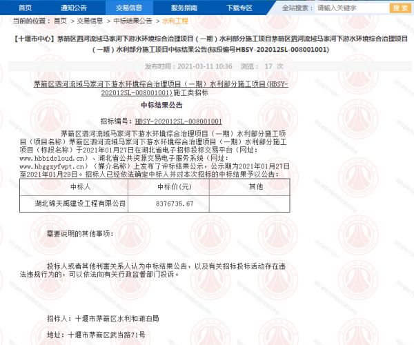 项目名称:茅箭区泗河流域马家河下游水环境综合治理项目(一期)水利部分施工项目项目编码:HBSY-202012SL-008001001招标人:十堰市茅箭区水利和湖泊局相关网络截图:相关原文链接:茅箭区泗河流域马家河下游水环境综合治理项目(一期