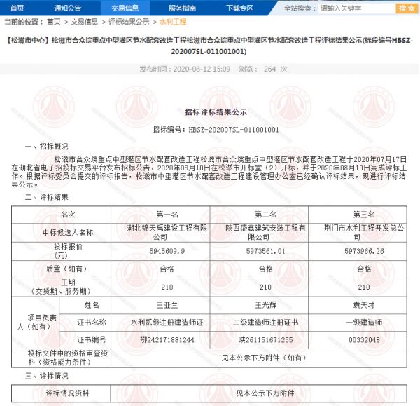 项目名称:松滋市合众垸重点中型灌区节水配套改造工程项目编码:HBSZ-202007SL-011001001招标人:松滋市中型灌区节水配套改造工程建设管理办公室相关网络截图:相关原文链接:松滋市合众垸重点中型灌区节水配套改造工程评标结果公示