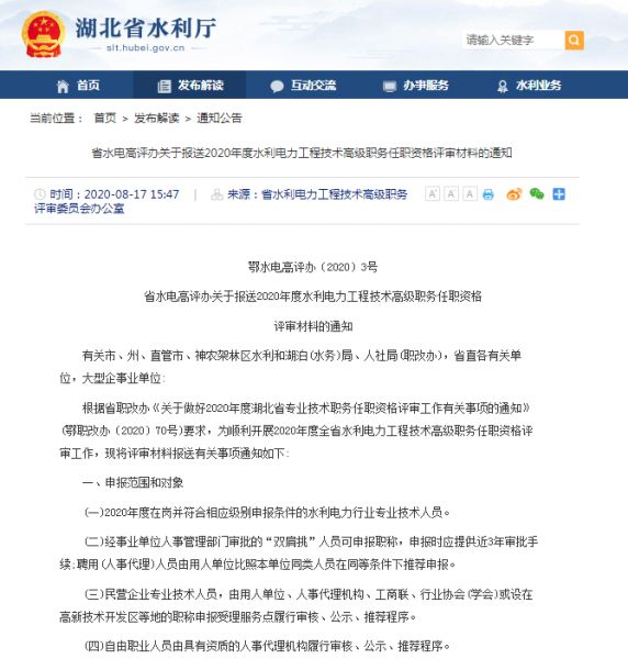 相关网络截图:相关原文链接:省水电高评办关于报送2020年度水利电力工程技术高级职务任职资格评审材料的通知
