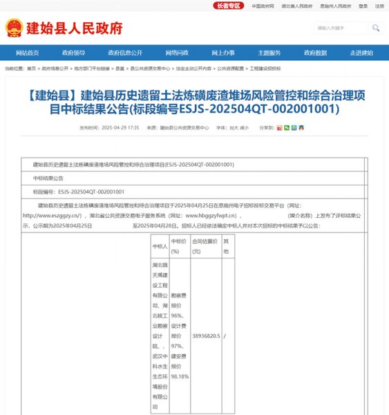 项目名称:建始县历史遗留土法炼磺废渣堆场风险管控和综合治理项目工程总承包(EPC)(联合体1)招标编码:ESJS-202504QT-002001001招 标 人:建始县业州镇人民政府相关网络截图:相关网络链接:建始县历史遗留土法炼磺废渣堆场