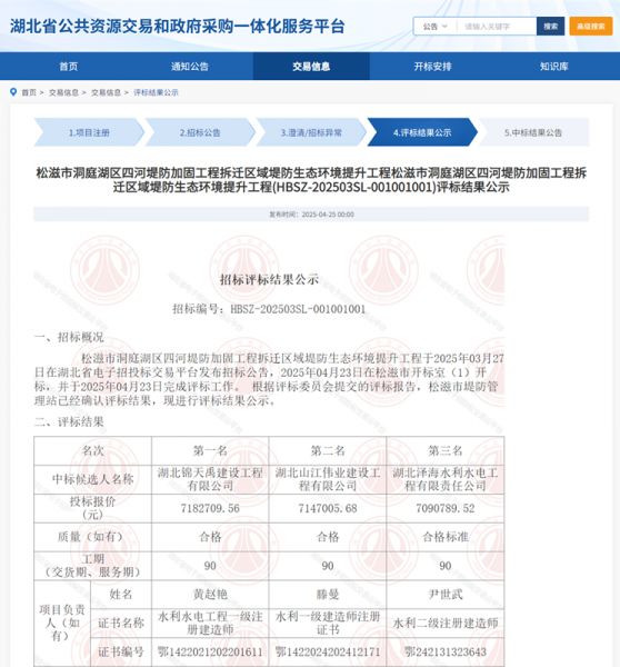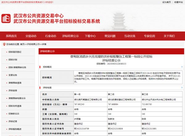 项目名称:蔡甸区消泗乡兴无垸堤防洪补短板整治工程第一标段招标编码:202504031126560155招 标 人:武汉市蔡甸区消泗乡人民政府相关网络截图:相关网络链接:蔡甸区消泗乡兴无垸堤防洪补短板整治工程第一标段公开招标评标结果公示
