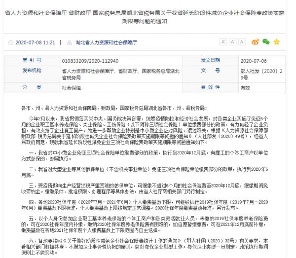 相关网络截图:相关原文链接:省人力资源和社会保障厅 省财政厅 国家税务总局湖北省税务局关于我省延长阶段性减免企业社会保险费政策实施期限等问题的通知