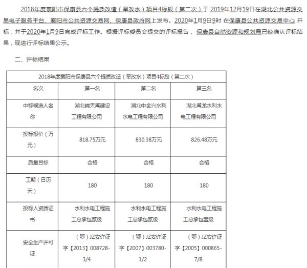 项目名称:2018年度襄阳市保康县六个提质改造(旱改水)项目4标段中标编号:BKZHZB-2020-001招标人:保康县自然资源和规划局相关网络截图:相关网络连接:http://jyzx.xiangyang.gov.cn/jyxx/gcjs