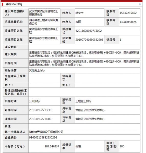 项目名称:黄陂区滠水东堤防渗墙工程 项目编号:42011620190715002 招标人:武汉市黄陂区河道堤防工程管理总段 相关网络链接:https://www.whzbtb.com/V2PRTS/WinningPublicityInfoDetail.do?id=201909260823568471