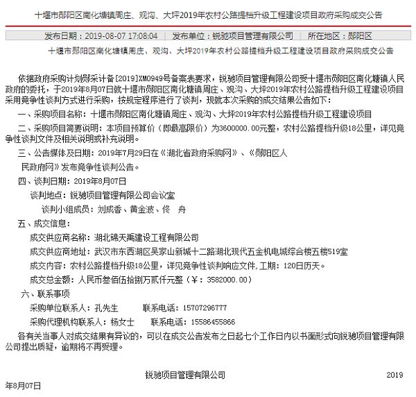 项目名称:十堰市郧阳区南化塘镇周庄、观沟、大坪2019年农村公路提档升级工程建设项目政府采购 招标人:十堰市郧阳区南化塘镇人民政府 相关网络链接:http://www.ccgp-hubei.gov.cn//notice/201908/notice_9gYaX7DtHaZkVzv5.html?tdsourcetag=s_pcqq_aiomsg
