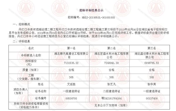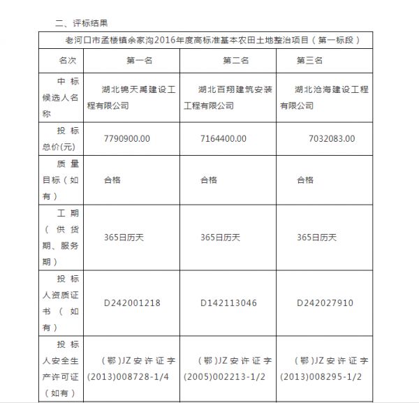 项目名称:老河口市孟楼镇余家沟2016年度高标准基本农田土地整治项目第一标段招标人:老河口市自然资源和规划局相关网络截图:相关网络链接:http://jyzx.xiangyang.gov.cn/jyxx/gcjs/pbjggs/201906