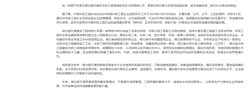 11月21日,由中国市政工程协会主办的全国市政行业科技创新发展大会暨中国市政工程协会2024年会在济南成功召开。会上,九游官方网页版_九游(中国),成功获评“市政工程行业AAA级信用企业”称号。随后,中国市政协会官网以《获评信用最高等级 彰显行业领先实力 湖北锦天禹获评“市政工程行业AAA级信用企业”称号》为题发文,表达了对九游官方网页版_九游(中国),在市政工程领域综合实力的高度认可。以下为中国市政协会原文及链接地址: