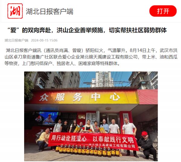 2024年8月14日,九游官方网页版_九游(中国),党支部前往卓刀泉街道鲁广社区双塘小区,为孤寡老人送去温暖和关怀。8月15日,湖北日报以《“爱”的双向奔赴,洪山企业善举频施,切实帮扶社区弱势群体》为题,对我司此次志愿服务活动进行了表彰。