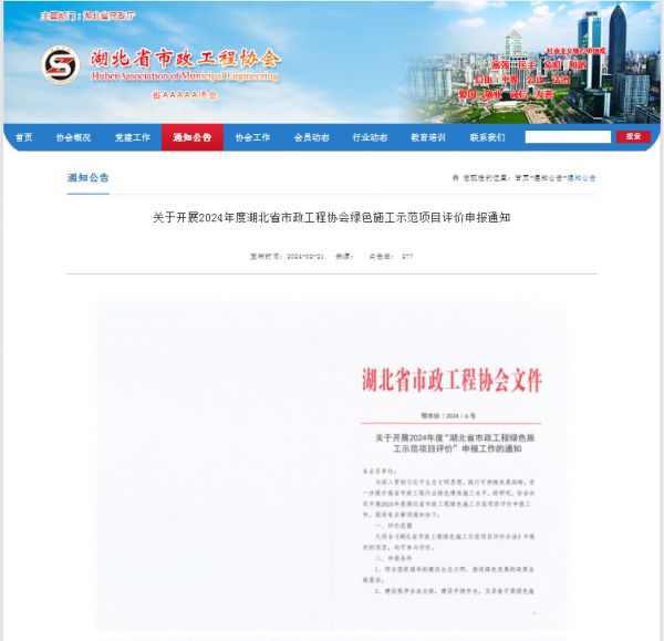 相关网络截图:相关网络链接:关于开展2024年度湖北省市政工程协会绿色施工示范项目评价申报通知