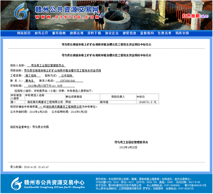 项目名称:寻乌县石排废弃稀土矿矿山地质环境治理示范工程结余资金项目